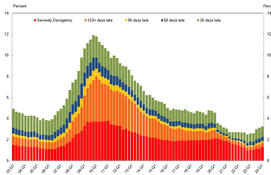 The Household Debt and Credit Report indicate that delinquencies of 90 days+ for all types credit are on the rise, and some exceeding or moving closer to levels not seen since the Great Financial Crisis.