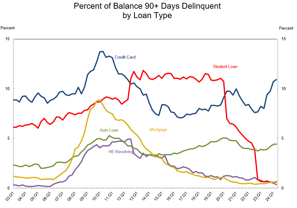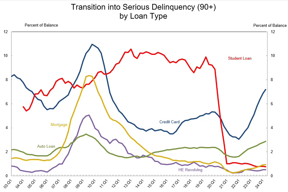 There is a noticeable and rapid rate of growth in auto and credit loans becoming “Seriously Delinquent”, meaning 90+ days past due. Will these get amplified with student loans in the future? Since these trends are leading indicators, it is likely we will continue to see noticeable growth in the number of seriously delinquent loans of all different types.